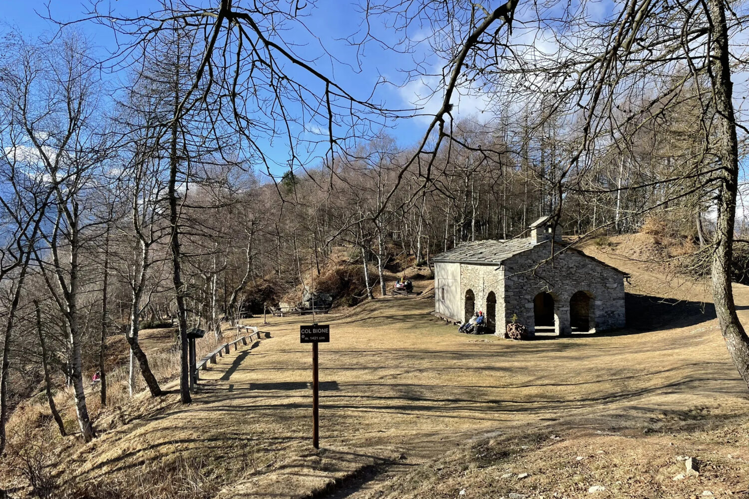 Il Colle Bione, a circa 1430 metri di altitudine, è un storico punto di passaggio tra la Valle di Susa e la Val Sangone, raggiungibile tramite diverse vie, tra cui una variante ad anello partendo dal Colle Braida. L’itinerario si sviluppa inizialmente con una salita nel bosco di circa 2 km, seguendo una strada sterrata che si mantiene abbastanza larga e battuta. Dopo circa 5 km si raggiunge la Cima Piana (1476 m), da cui si gode di una vista panoramica e si può ammirare la Cappella della Madonna della Neve, punto di arrivo al Colle Bione, dove si trovano anche tavoli per un pranzo al sacco.