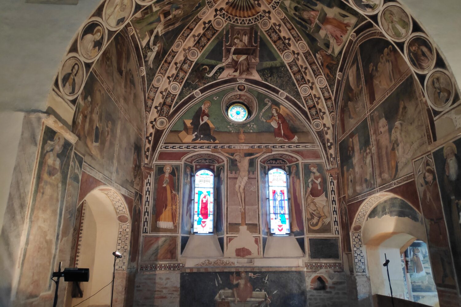 L’interno si propone a unica navata, con decorazione pittorica iniziata da Giacomo Jaquerio e dalla sua scuola, agli inizi del XV secolo; suggestiva rimane la Crocifissione al fondo dell’abside. è anche presente un solo affresco di Aimone Duce contemporaneo del Jaquerio, raffigurante San Sebastiano trafitto dalle frecce.